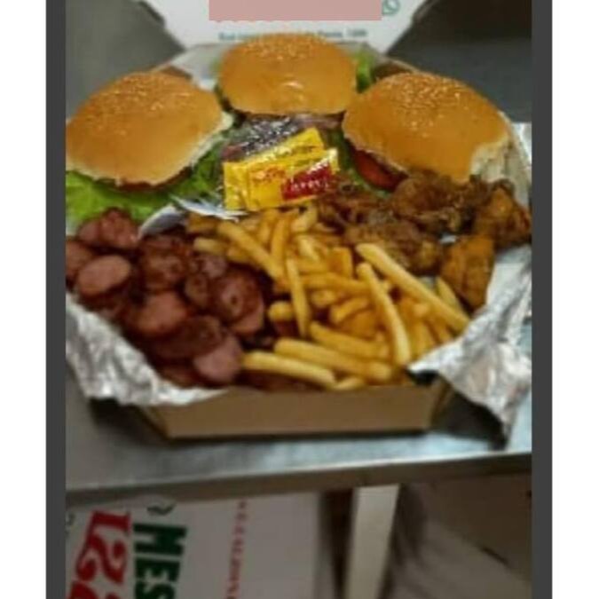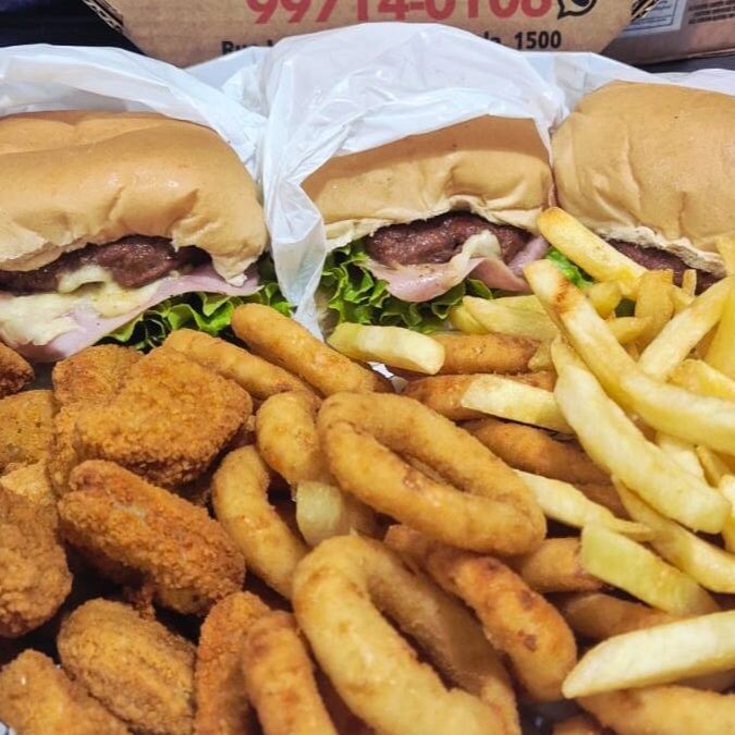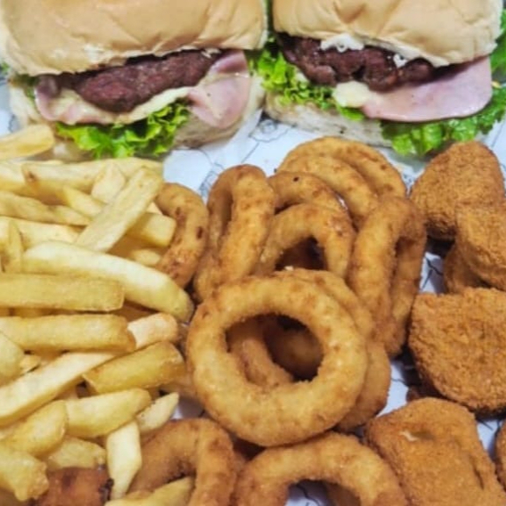 3 X-salada com hambúrguer artesanal + 300g de anéis de cebola + 300g de nuggets de frango + 400g de batata frita + 1 Coca-Cola 2l.