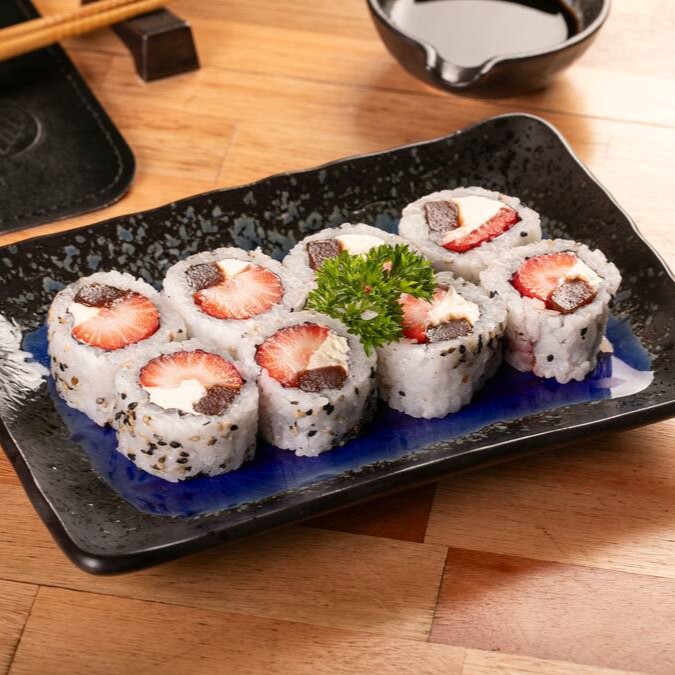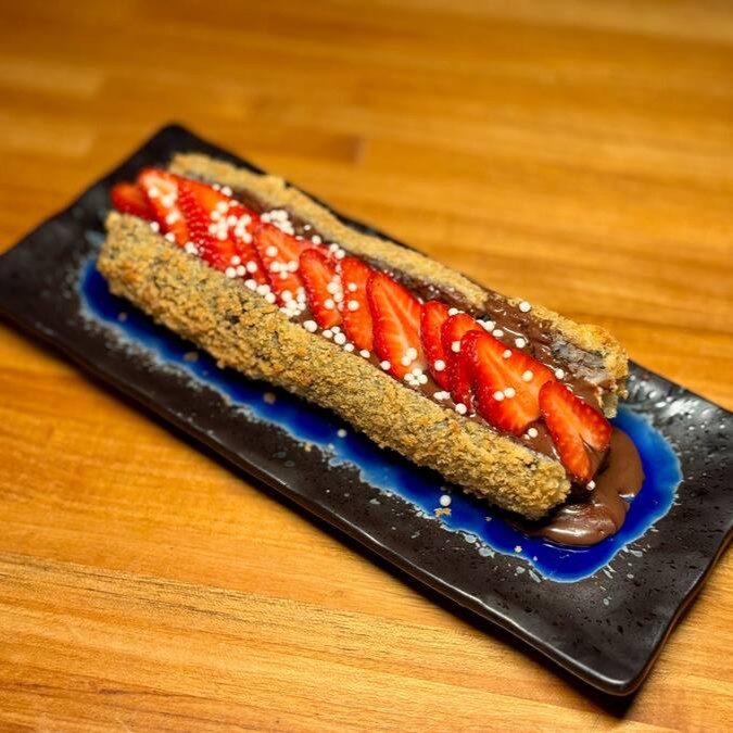Nosso Japa Dog é super bem servido em uma alga empanada em nossa farinha Panko recheada com arroz! Depois aberto ao meio e recheado com creme de avelã, pedaços de morangos frescos e finalizado com flocos de arroz para dar aquele toque especial.