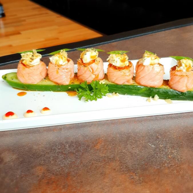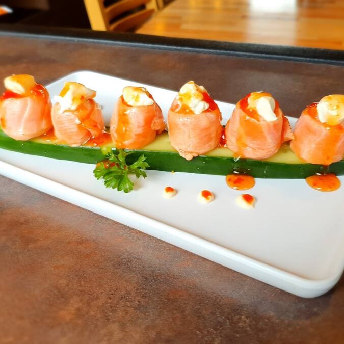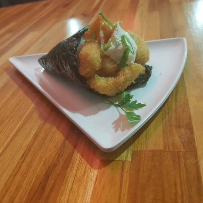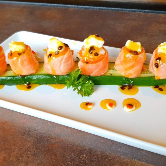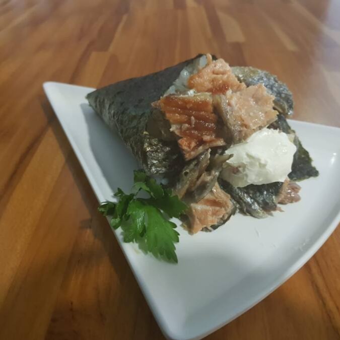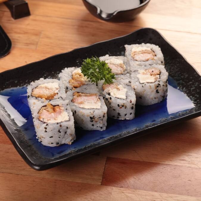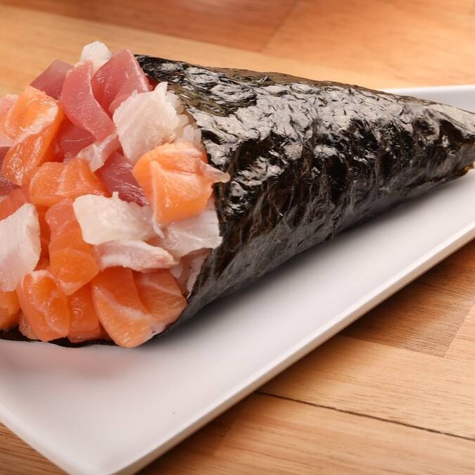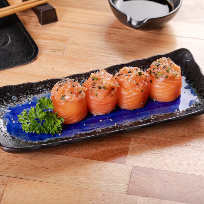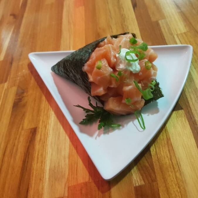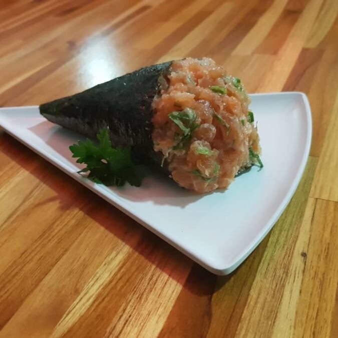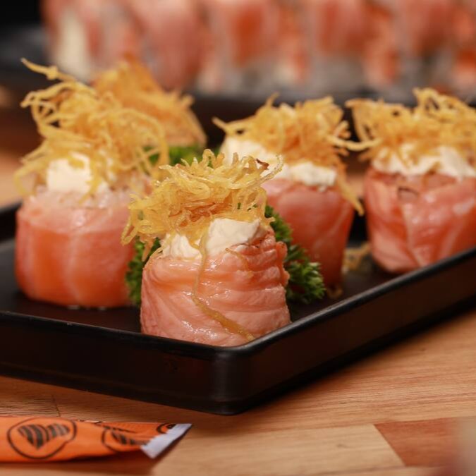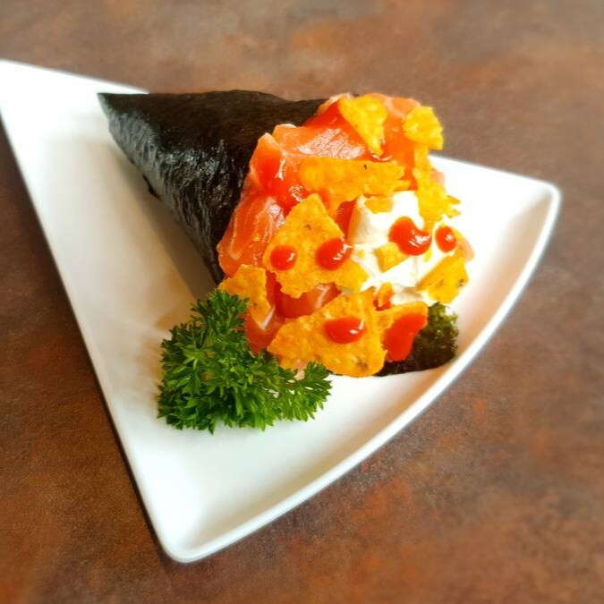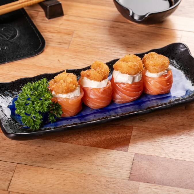 O mais novo queridinho da galera. Sushi em formato de cone com recheio de arroz, salmão, cream cheese, cebolinha, empanados na farinha panko e frito.
