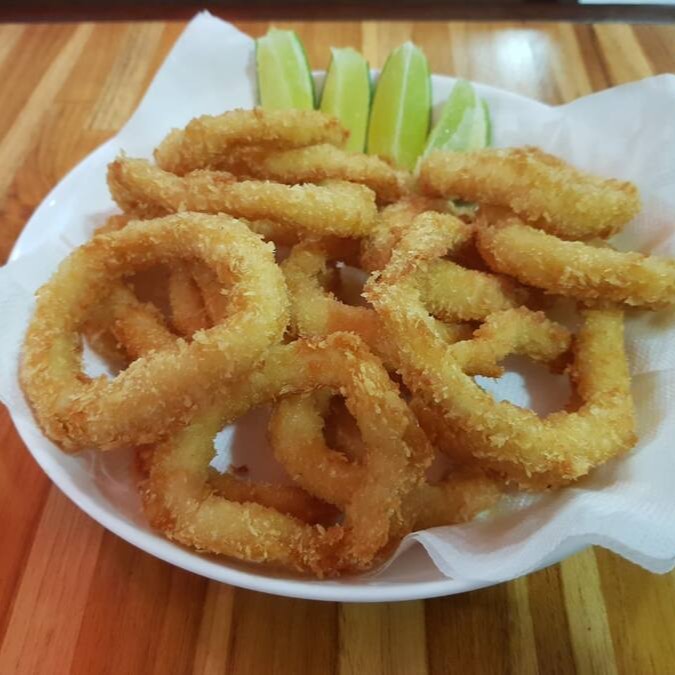 (300g)anéis de lula empanada com molho barbecue ou tonkatsu.
