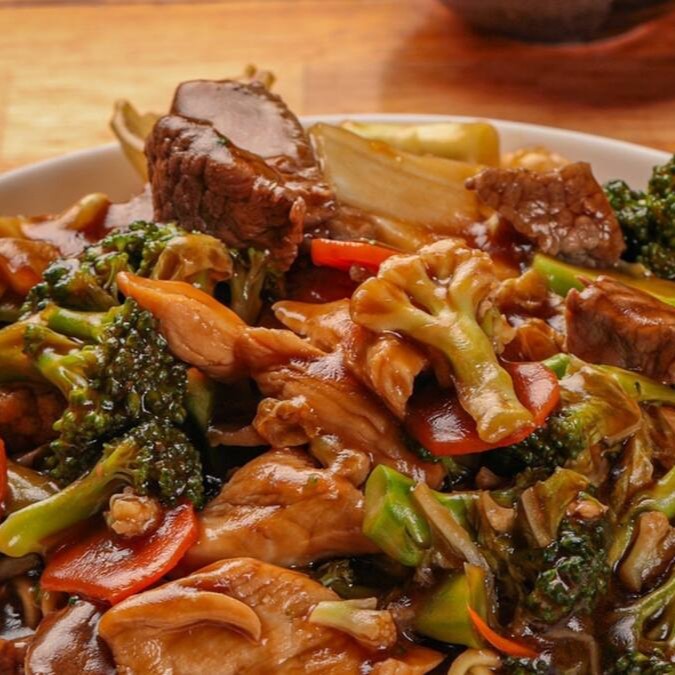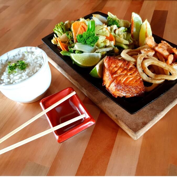 100g de camarão, 100g de lula, 100g de salmão grelhado na chapa, 300g de legumes salteados na manteiga, acompanhado de 200g de gohan (arroz).