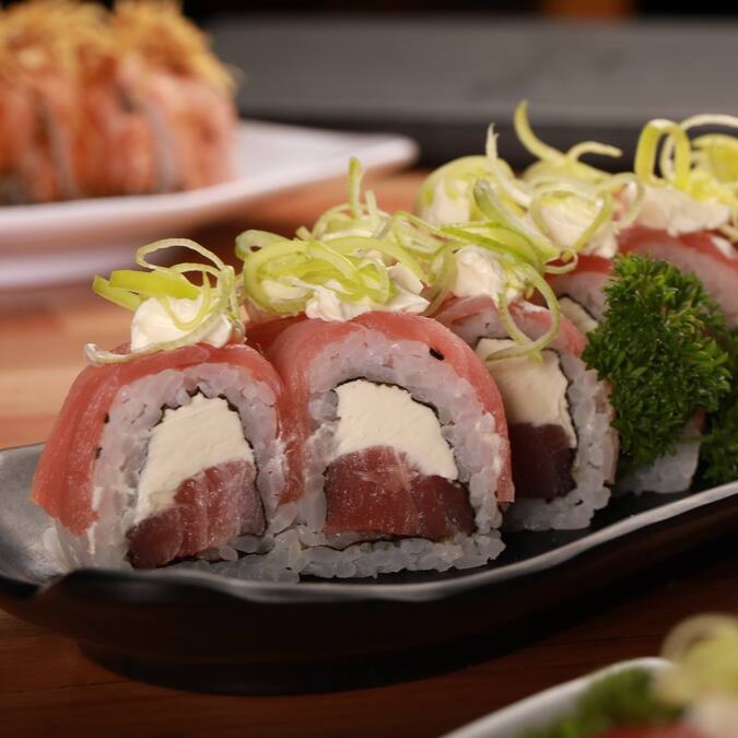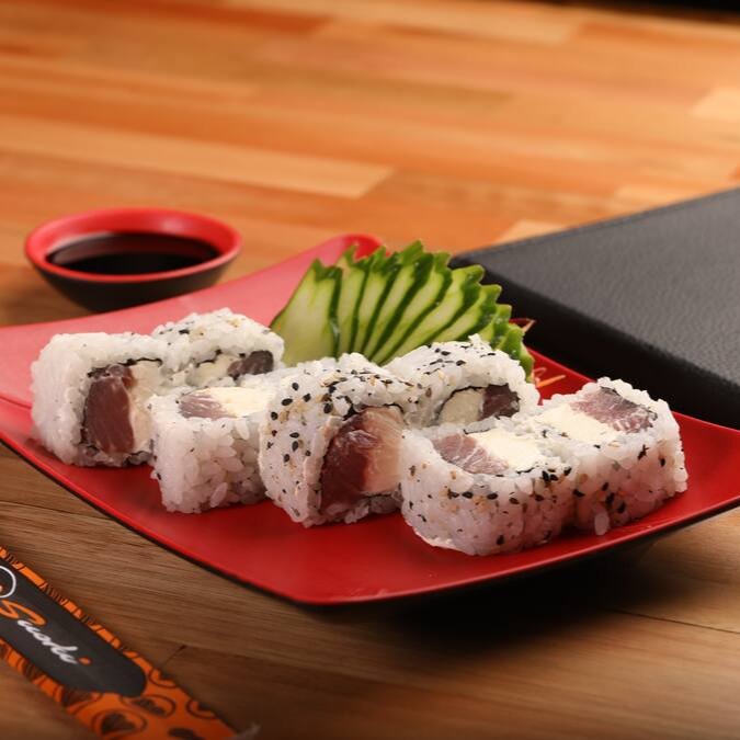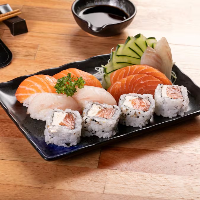 4 uramaki Filadélfia, 4 atum grelhado, 4 skin fila, 4 romeu e julieta, 4 shake e 4 tekka.