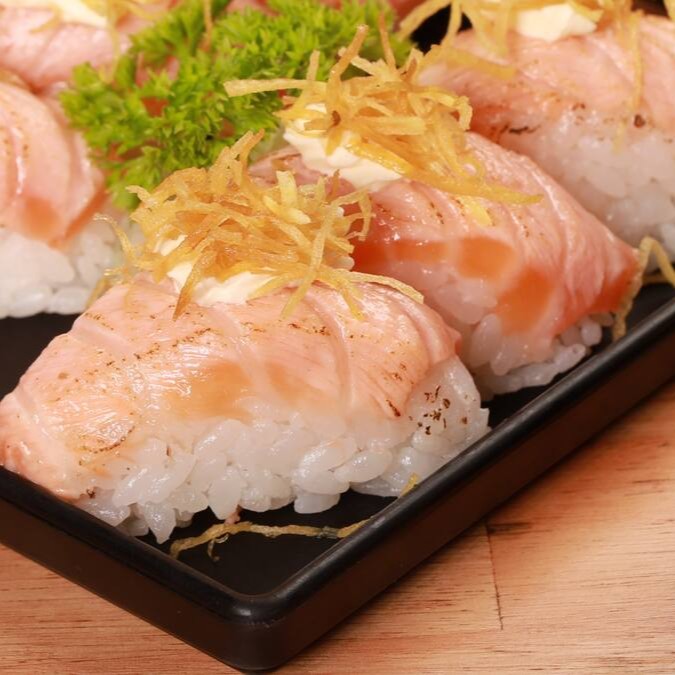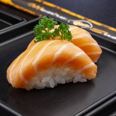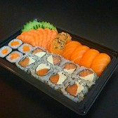 6 sashimi salmão (opcional flambado), 4 ebitem, 4 joe ebi, 4 salmão master, 3 aburi, 3 niguiri salmão. Acompanha molho de ostra.