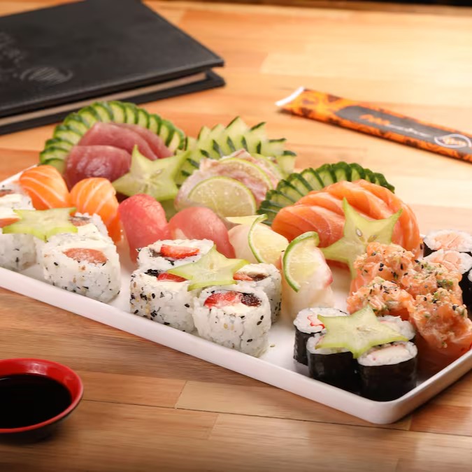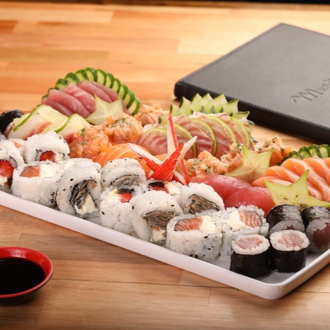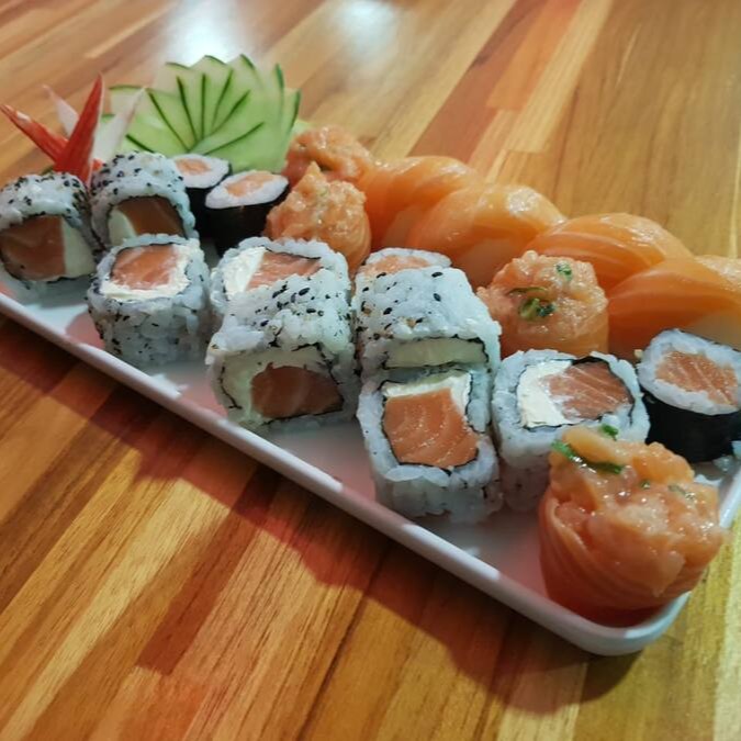 Sashimi misto (12), Niguiri misto (6), Uramaki Filadélfia(4), Joe(6),Romeu e Julieta(4), Shake(4),Kani Maki(4), Skin Filadélfia(4) e Tekka(4)