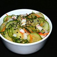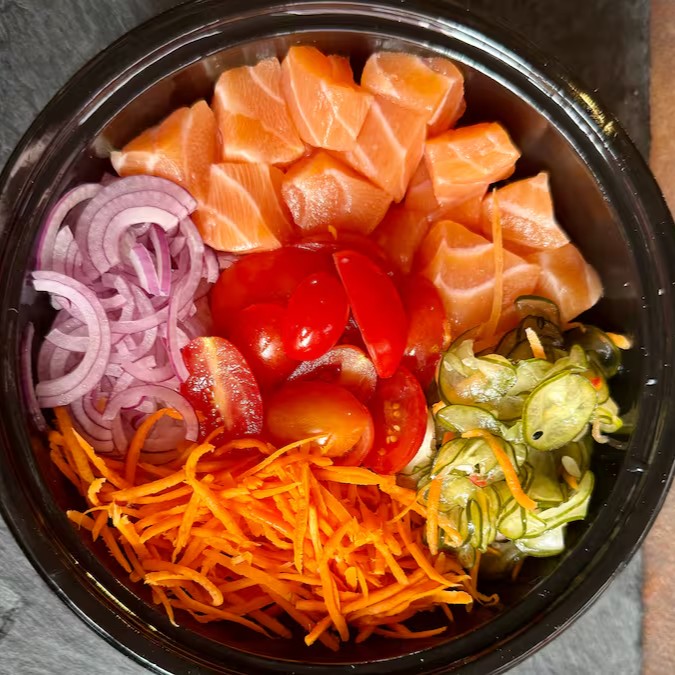 Base de arroz (shari), Salmão em cubos, cebola roxa, cenoura, sunomono e tomate cereja