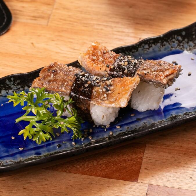Sushi em formato de cone com recheio de arroz, pele de salmão grelhada e cream cheese