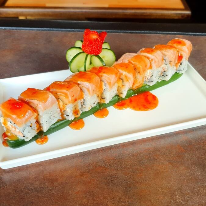 Base de arroz (shari), Salmão grelhado, crispy de batata doce, kani, manga e sunomono.
