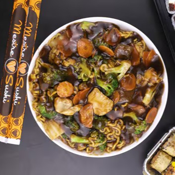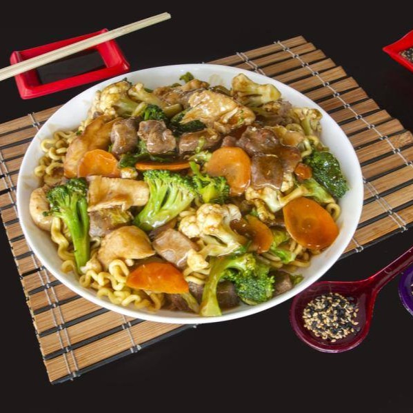 1.100kg. Macarrão cozido do tipo lámen. Com pedaços de carne, frango e legumes frescos, preparados com um molho da casa. Não vai cebola e pimentão. Não precisa adicionar shoyu.