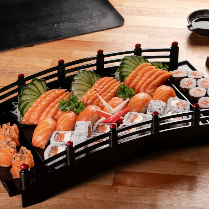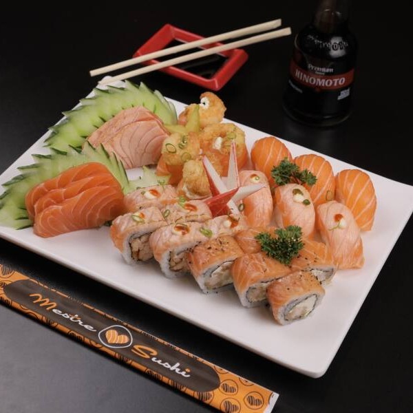 10 sashimi salmão (opcional flambado), 4 joe ebi, 10 ebitem, 10 salmão master, 8 hot e 6 aburi.