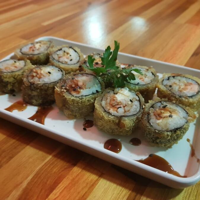 Base de arroz (shari), Tilapia empanada, cream cheese, crispy de couve, kani e tomate cereja.