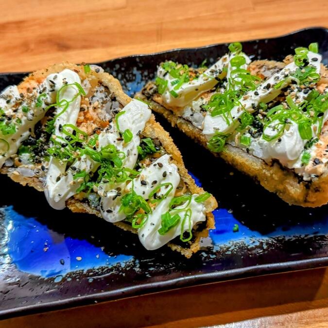 Nosso Japa Dog é super bem servido em uma alga empanada em nossa farinha Panko recheada com arroz e com cremoso cream cheese! Depois aberto ao meio e recheado com 120g de salmão grelhado fresco, muito cream cheese, finalizado com crispy de batata doce.