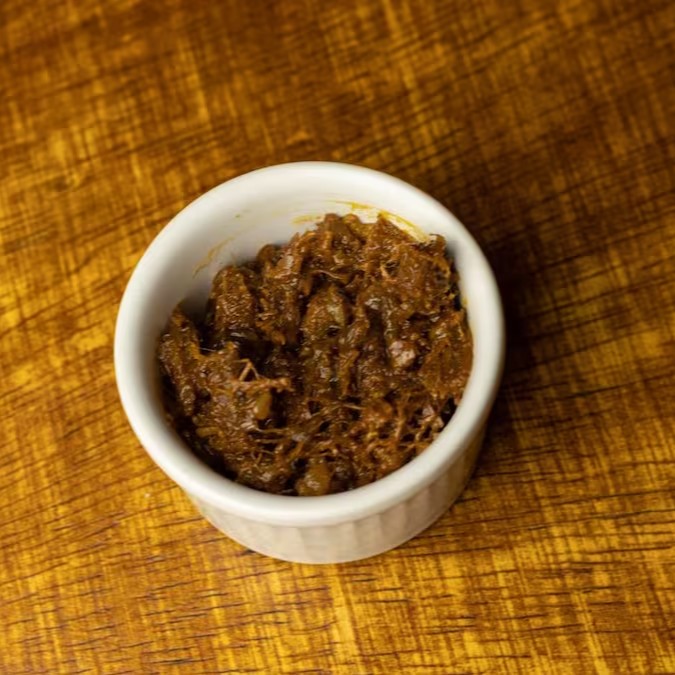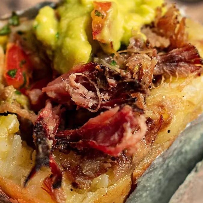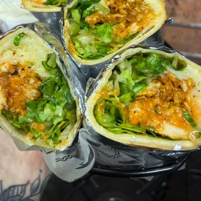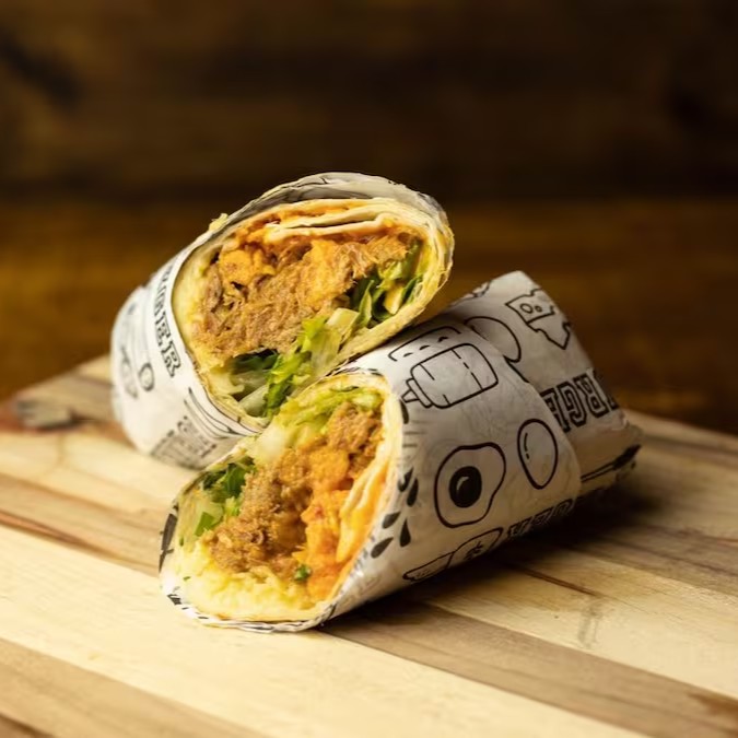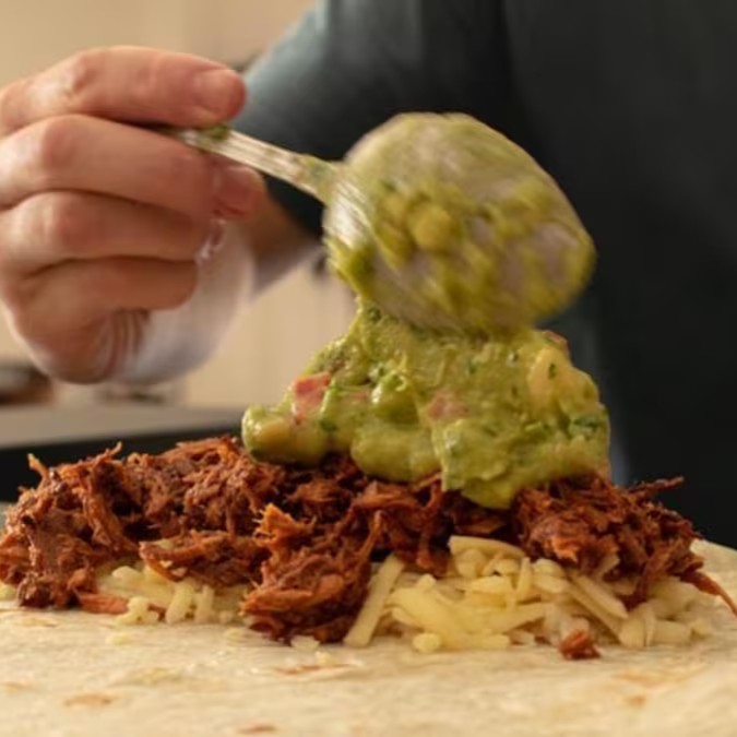 Tortilha de trigo recheada com barbacoa, alface americana, cheddar, queijo mussarela e geleia de pimenta.