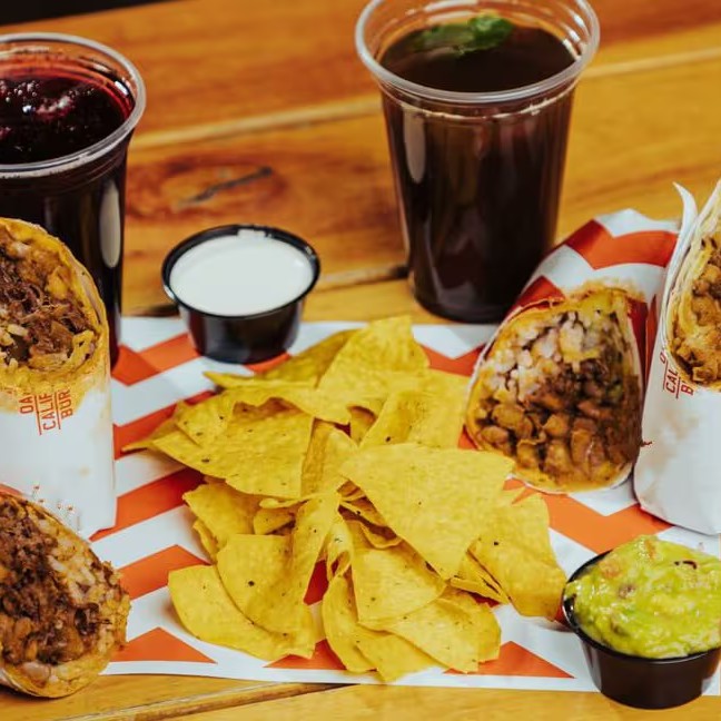2 burritos + 2 porções de tortilhas ou batatinha frita + 2 molhos & 2 refris.