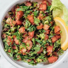 Folhas verdes, tomate,pepino, rabanete. cebola roxa, salsa, hortelã, pite frito, limão e melaço de romã