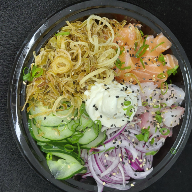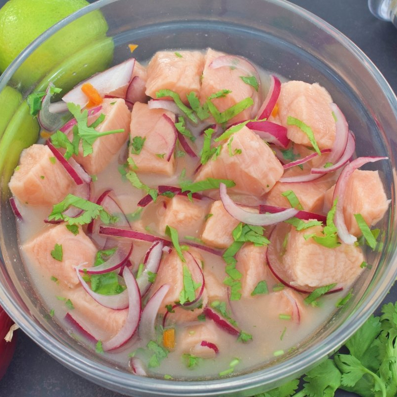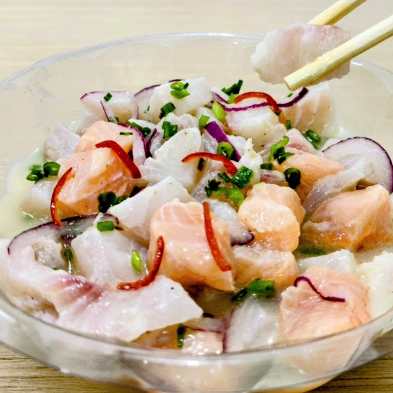 Salmão e tilapia em cubos cebola roxa cebolinha pimenta dedo de moça molhinho do cheff porçao bem servida 300gm300gm