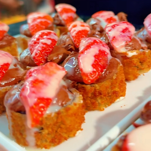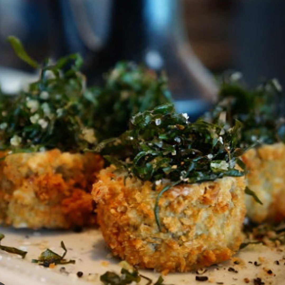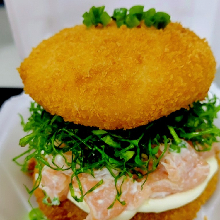 Camarão empanado salmao em cubos crean chesse manga chispe de alho poró