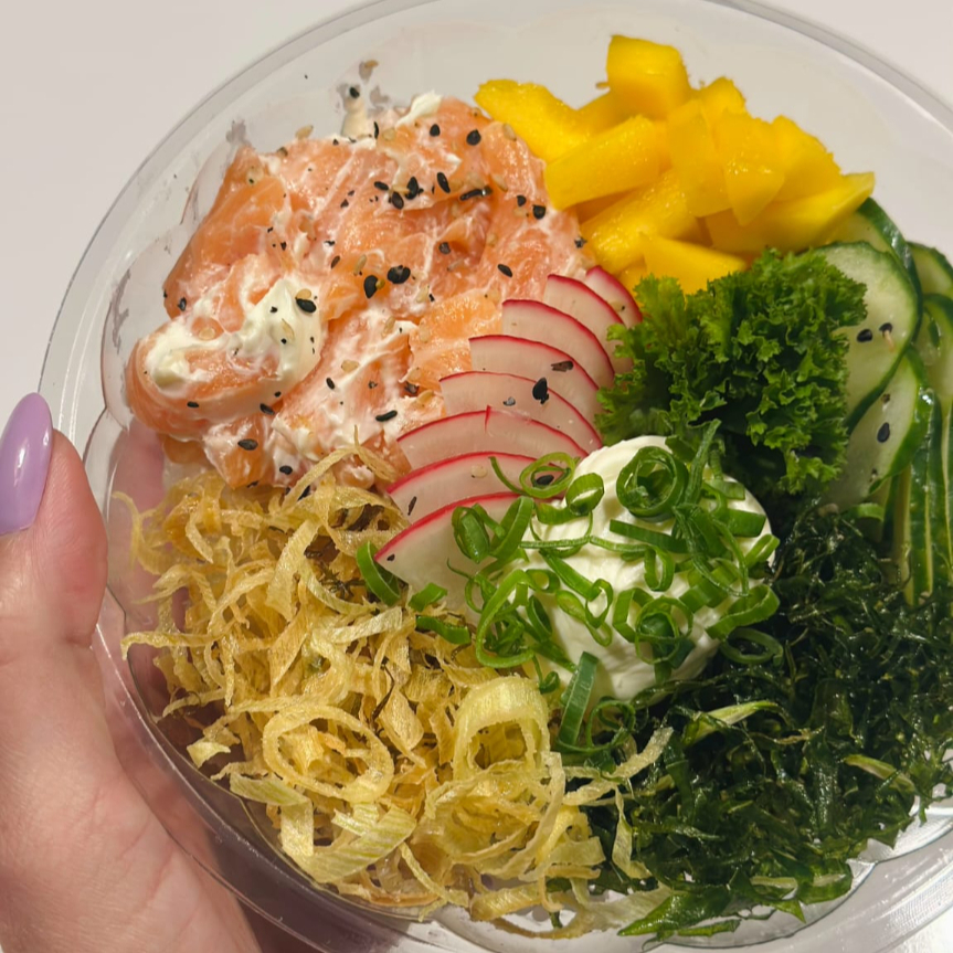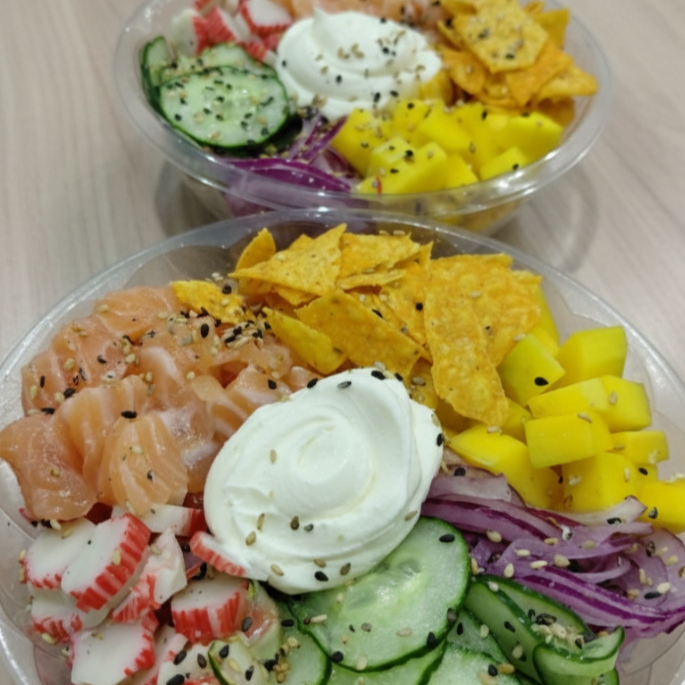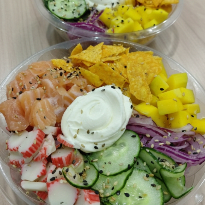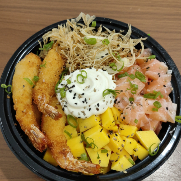 Salmao e tilapia em cubos cebola roxa crispe de alho poro sunomono e manga