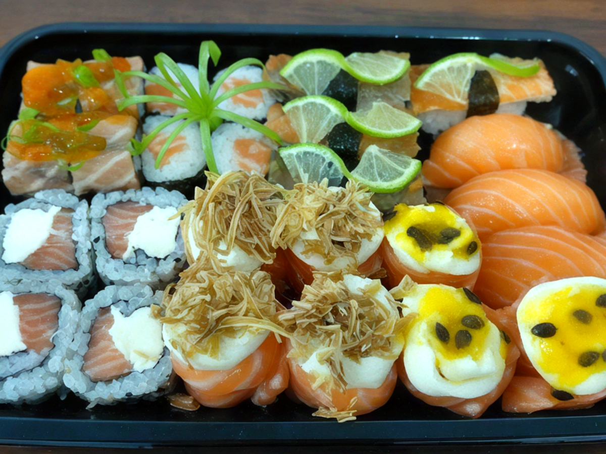 4 filadelfia 4 hossomaki 4 shakimaki laminado c gelia de pimenta 4 niguiri skim 3 niguiri de Salmão 4 joe de alho poro 3 joe de maracujá