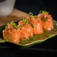 Salmão em cubos cebola roxa cebolinha pimenta dedo de moça molhinho do cheff porçao aproximadamente 300gm