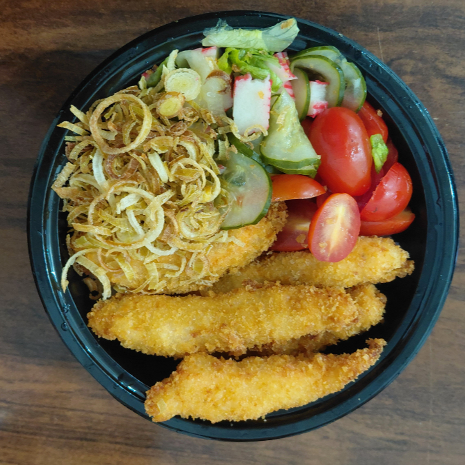Isca de tilapia crispe de alho poro tomate cereja sunomono e kani crean cheese 350gm
