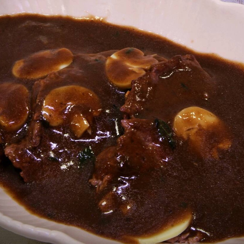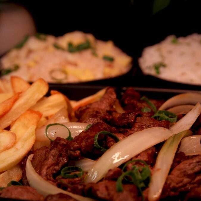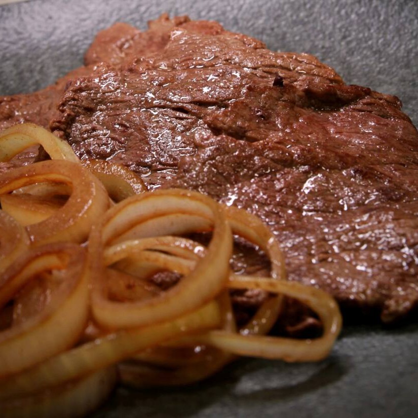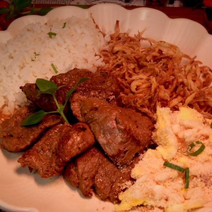 Mignon grelhado em tiras com cebolas caramelizadas . Acompanha arroz branco, farofa de ovos e batatas fritas.