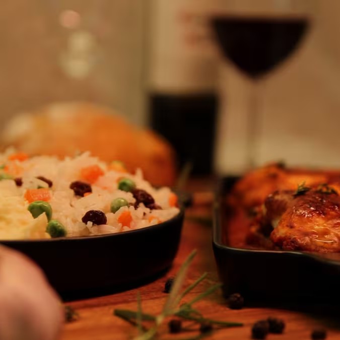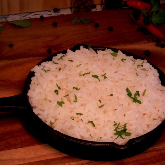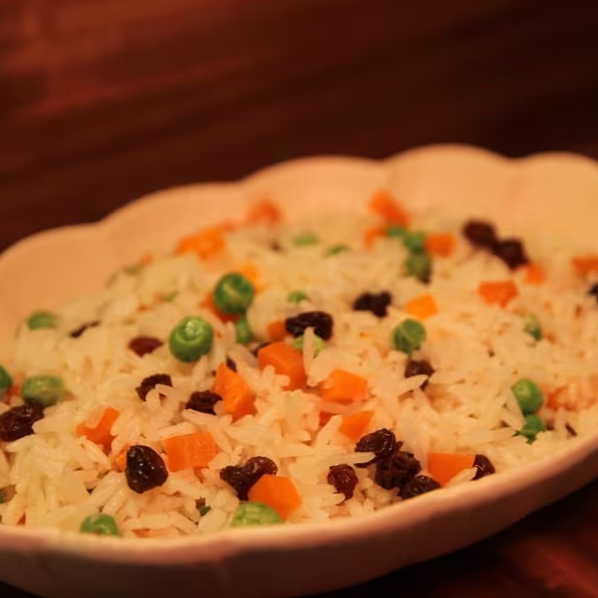 Arroz branco soltinho, temperado com cubos de cenoura, ervilha fresca e uvas passas. Serve 2 pessoas