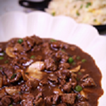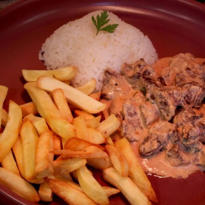 Cubos de Mignon (aprox. 180g para 1 Pessoa, 360g para 2 Pessoas e 540g para 3 Pessoas, carne in natura)flambados cobertos com molho strogonoff feito de creme de leite, ketchup e mostarda. Acompanha arroz branco e batatas fritas.