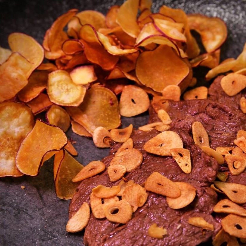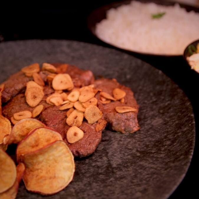 Medalhões de Mignon (aprox. 180g para 1 Pessoa, 360g para 2 Pessoas e 540g para 3 Pessoas, carne in natura) guarnecido com lâminas de alho. Acompanha arroz branco, farofa de ovos e chips crocante de batata-doce.