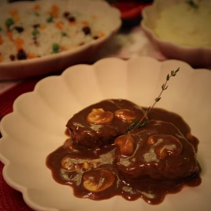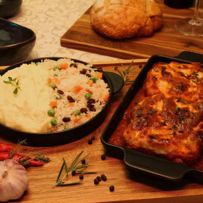 Apresentamos o orgânico 'Mignon ao Molho Madeira', para dois. Mignon em escalopes acompanhado de molho madeira, arroz à grega com temperos mediterrâneos e purê de batatas cremoso. Uma experiência gastronômica inesquecível. Serve 2 pessoas