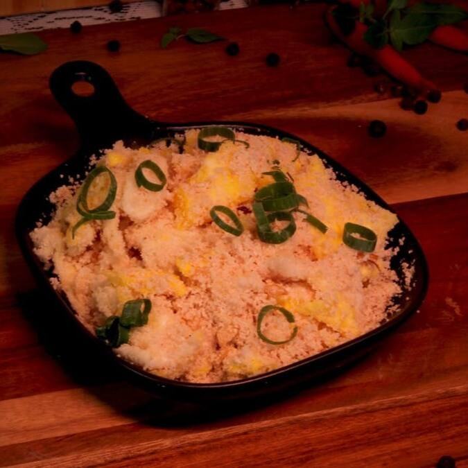 Farofa de mandioca, com ovos fritos e cebolinha picada por cima. Serve 2 pessoas