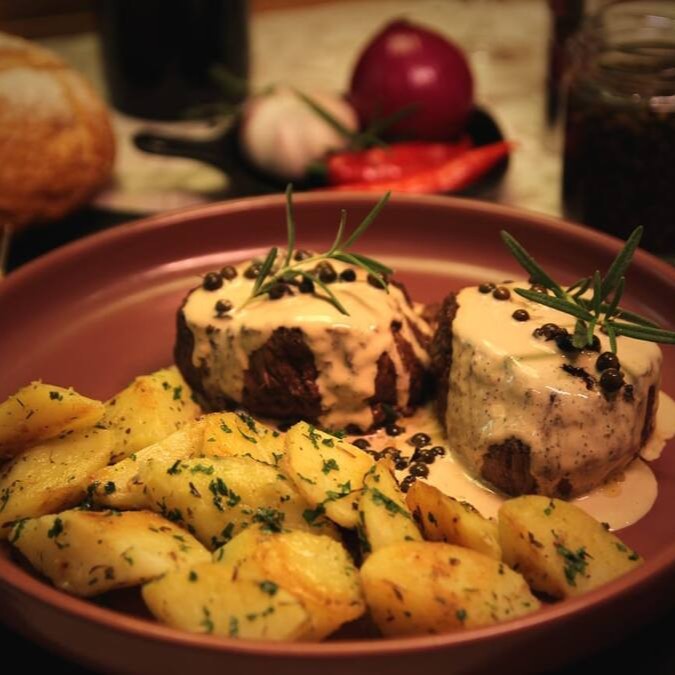 Medalhões de Mignon guarnecido molho de pimenta Poivre Vert. Acompanha arroz branco e batata temperadas com ervas.