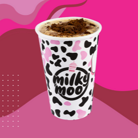 Almofada em formato de copo malhado, sendo uma face com a logo e a outra face com a Vaquinha Moo.