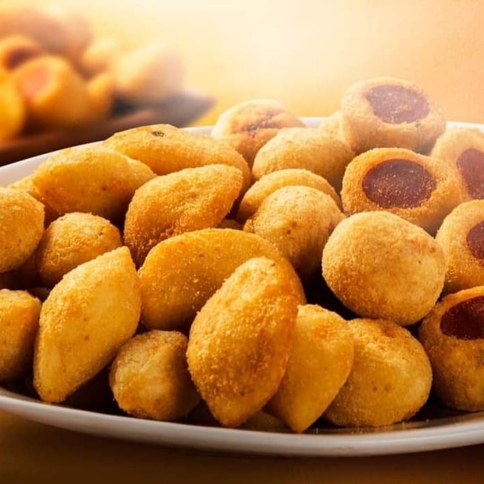 Desfrute do nosso combo com 50 mini coxinhas de frango de 15g, recheadas com frango suculento e bem temperado.