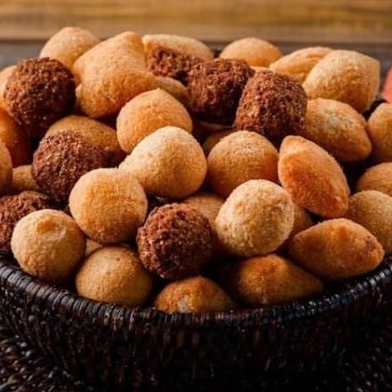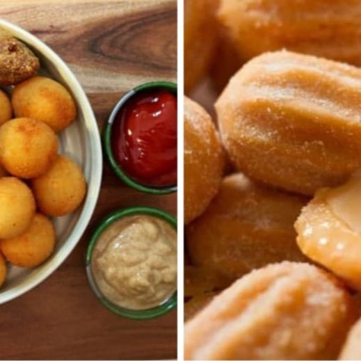 Combo perfeito com 20 mini churros recheados com doce de leite e 25 mini salgados, cada um pesando aproximadamente 15g.