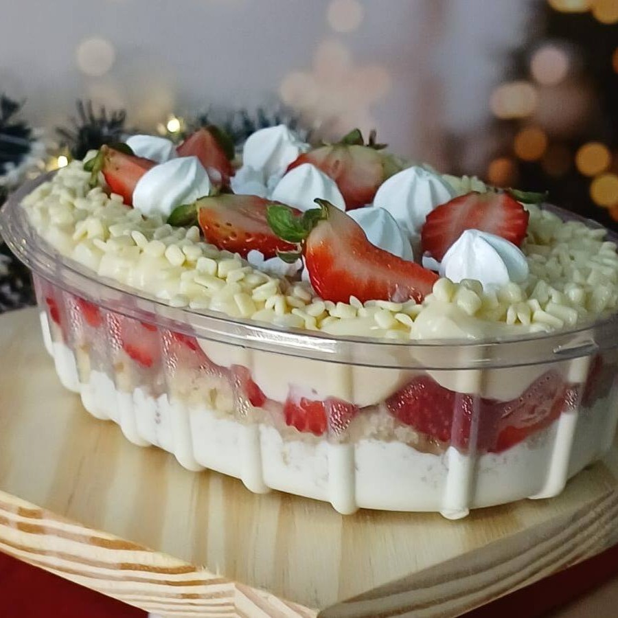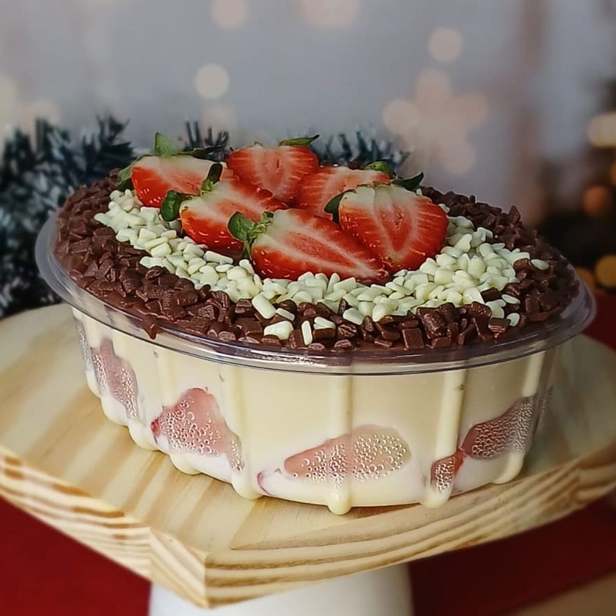 Sobremesa composta por mousse de Ninho, bolo de baunilha, morangos frescos e creme de Ninho. Finalizado com granulé, morangos e suspiros. Peso médio 600g.