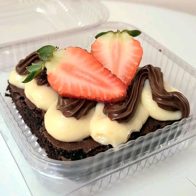 Um delicioso brownie com uma camada generosa de brigadeiro de leite Ninho e Nutella decorado com um morango. Peso em média 140g