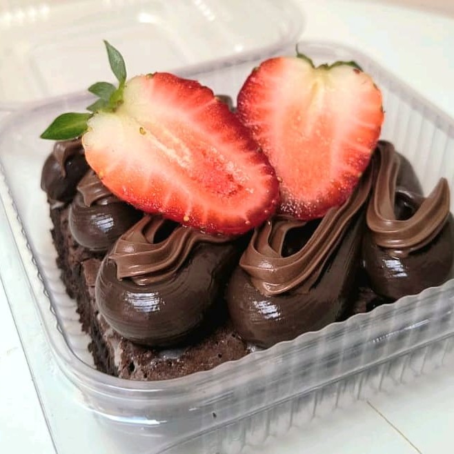 Um delicioso brownie com uma camada generosa de brigadeiro 50% cacau e Nutella, decorado com morango. Peso em média 140g