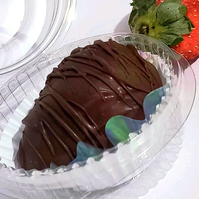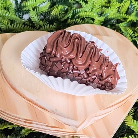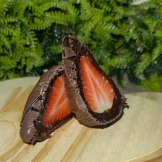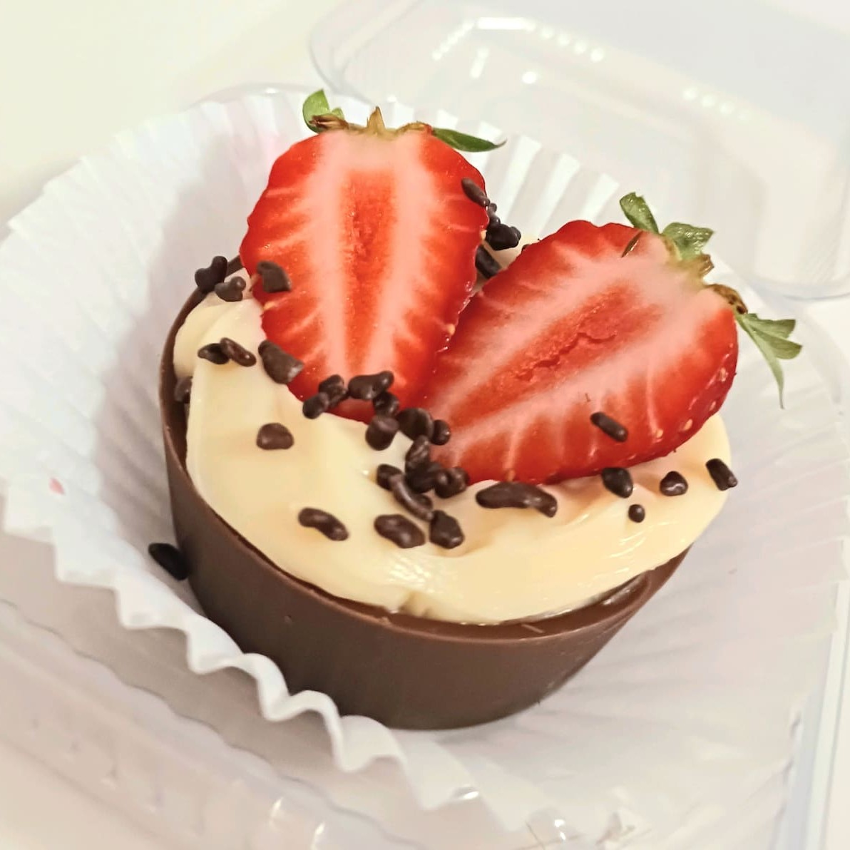 Deliciosa casquinha de chocolate recheada com morangos picados e um cremoso brigadeiro de leite Ninho. Peso em média 100g