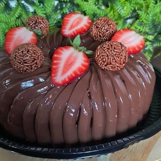 Bolo de chocolate super fofinho com uma deliciosa cobertura de brigadeiro 50% cacau, decorado com morangos e brigadeiros. Peso médio 700g