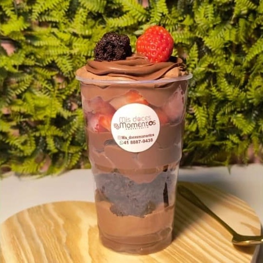 Copo da felicidade com diversas camadas, dentre elas, creme de chocolate 50% cacau, mousse de chocolate, brownie e Nutella pura. Copo de 300ml.