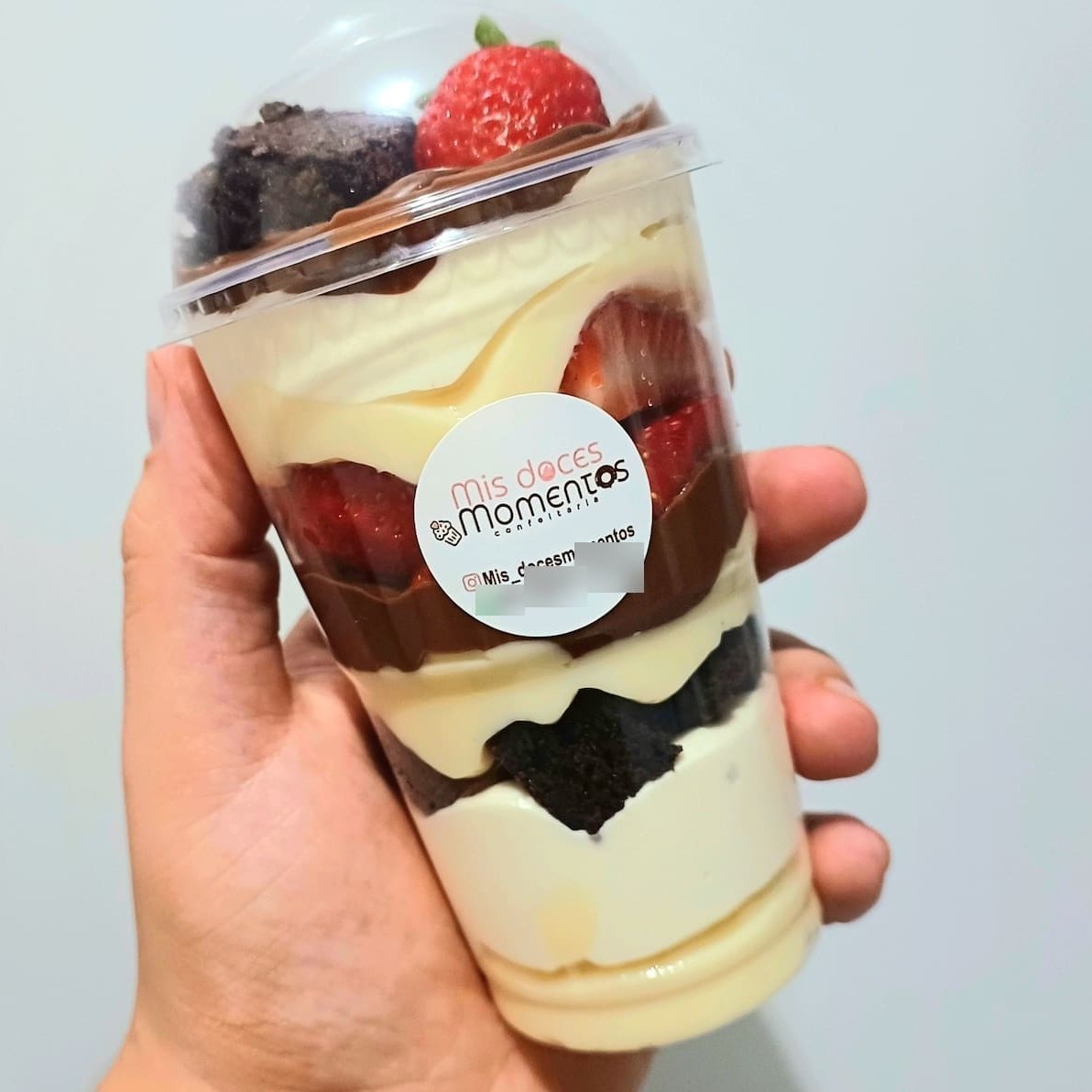 Copo da felicidade com diversas camadas, dentre elas, creme de Ninho, mousse de Ninho, creme de chocolate 50%, brownie e Nutella pura. Copo de 300ml, peso em média 350g.