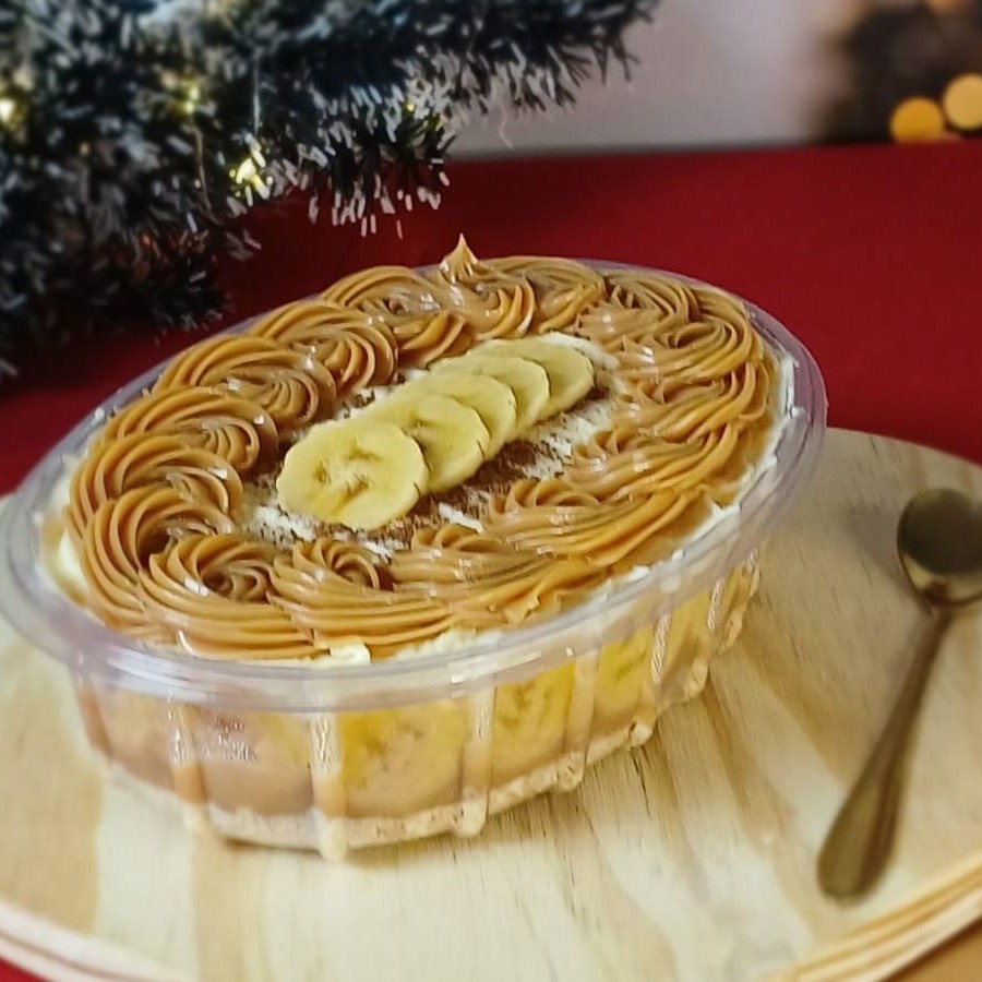 Sobremesa composta por biscoito maisena triturado, doce de leite, banana e nata. Finalizado com doce de leite e banana, com um toque de canela. Peso médio 600g.