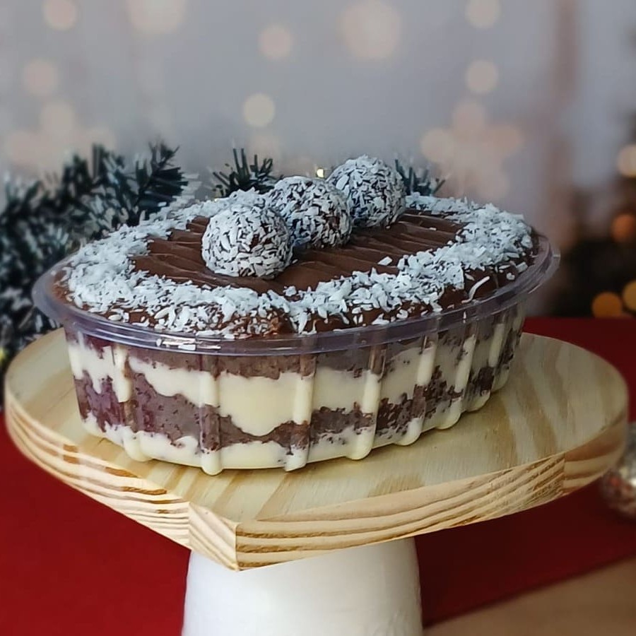 Bolo fofinho sabor chocolate com um saboroso recheio cremoso de doce de leite e cobertura de brigadeiro 50%. Pote de 250ml.
