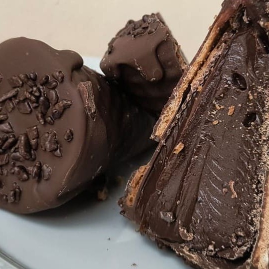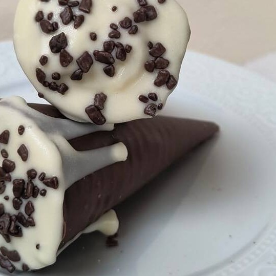 Deliciosa casquinha de chocolate recheada com um cremoso brigadeiro de cacau 50% e de coco. Peso em média 100g