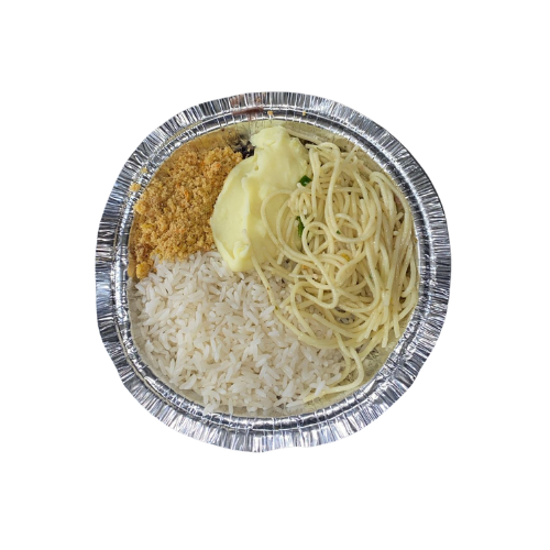 arroz parboirizado, feijão preto, macarrão alho e óleo com bacon e farofa (farinha de mandioca, cenoura ralada, cebolinha verde e bacon).