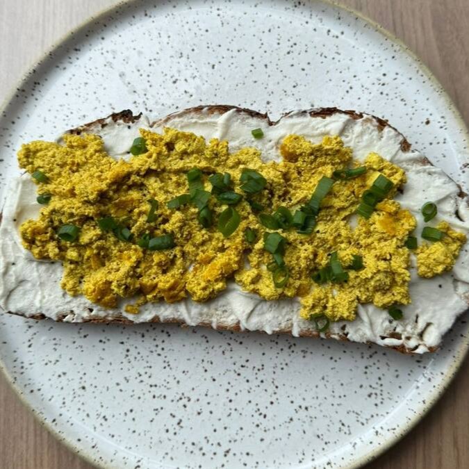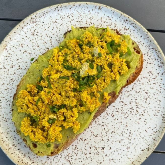 Pão de fermentação natural da Maçã, pastinha de avocado, tofu mexido com cúrcuma, finalizado com pimenta do reino, sal negro e cebolinha.