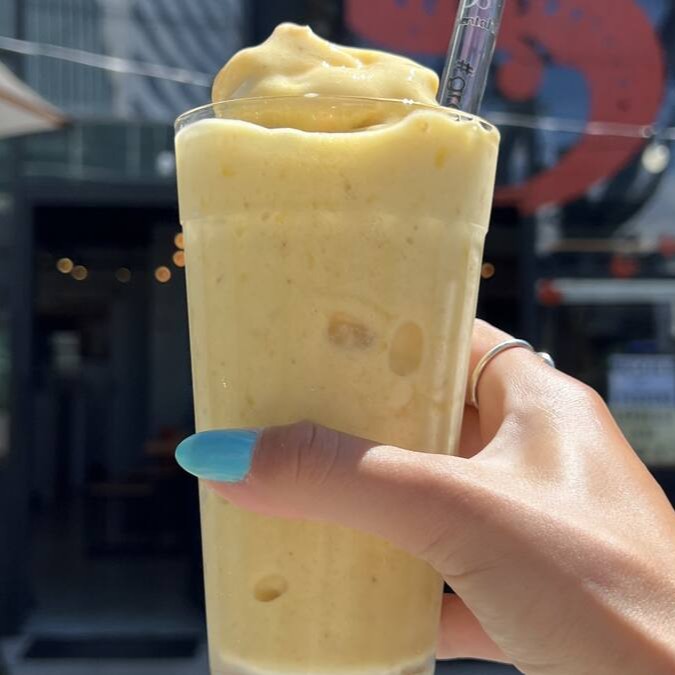Banana congelada batida com manga e suco de laranja. (400ml)