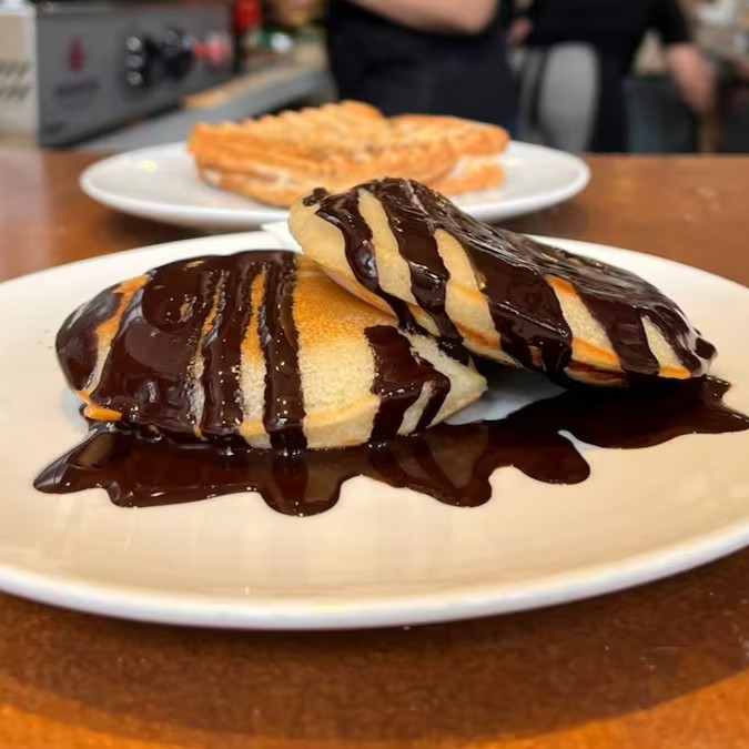02 discos fofinhos de panqueca americana à base de farinha de trigo, leite de aveia e açúcar. Para completar sua panqueca, escolha dois acompanhamentos: pasta de amendoim, melado, geleia de morango ou calda de chocolate.