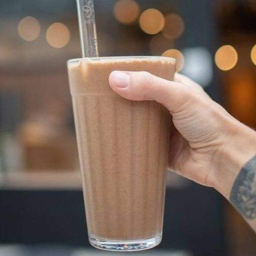 Banana congelada batida com leite de aveia Naveia, cacau em pó e pasta de amendoim. (400ml)
