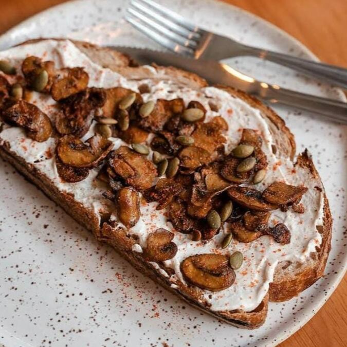 Pão de fermentação natural da Maçã, requeijão de castanha de caju, cogumelos refogados com páprica defumada, semente de abóbora torrada com lemon pepper.
